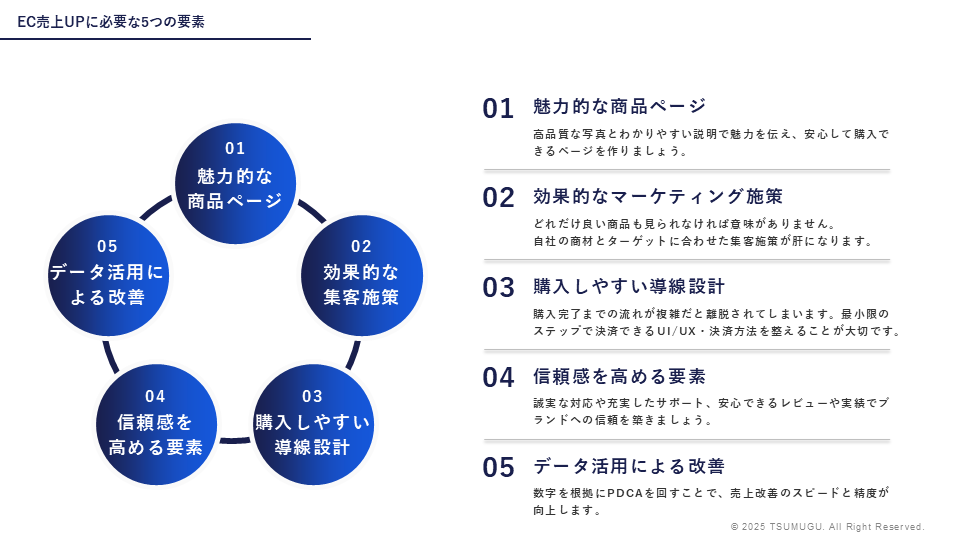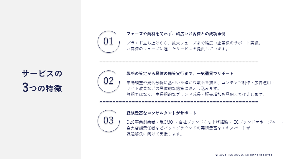 TSUMUGUでは課題に寄り添い、戦略立案からサイト構築、集客施策、運用改善に至るまで一気通貫でサポートします。豊富な実績に基づくノウハウと丁寧な支援により、初めてのEC立ち上げでも安心してお任せいただけます。