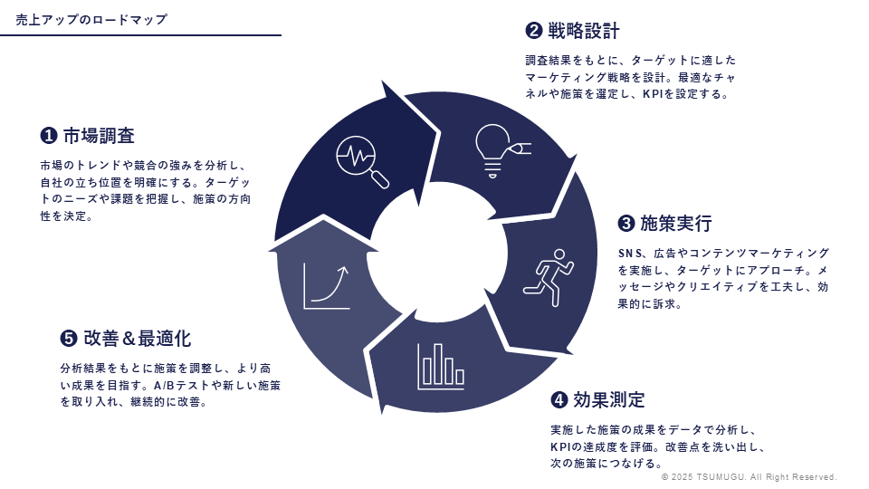 市場調査・競合分析・顧客インサイトから導いた戦略を、コンテンツ制作・広告運用・CRM・UI/UX改善など具体施策に落とし込み、伴走支援します。戦略と実行が分断されないからこそ、机上の理論ではなく、売上につながる実践的な改善が可能です。一時的な数字づくりではなく、中長期で伸び続ける「売れ続ける仕組み」を構築します。